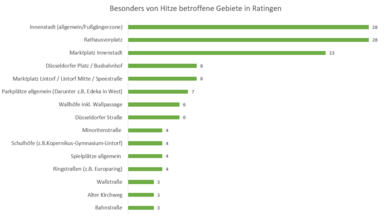 Um die sommerliche Erwärmung in Ratingen zu ermitteln, wurde im Jahr 2022 eine Klimaanalyse für das Stadtgebiet erstellt. Auf Grundlage verschiedener Daten, wie der Geländehöhe, der Strukturhöhe und der Landnutzung wurden mit Hilfe einer Simulation verschiedene Kartenwerke erstellt. Diese zeigen Bereiche auf, die besonders von der sommerlichen Hitze betroffen sind, sowohl tagsüber als auch nachts. Die Karten dienen einerseits der Stadtgesellschaft als Information, andererseits aber auch der Stadtplanung als Grundlage für zukünftige Bauvorhaben.