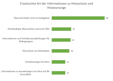 Neben allgemeinen Angaben zu Geschlecht, Alter und Wohnort wurden konkrete Fragestellungen zum Thema Hitze gestellt. Die Teilnehmenden konnten unter anderem angeben, welche Orte und Plätze im Stadtgebiet besonders von Hitze betroffen sind und welche Orte andererseits gern aufgesucht werden, um sich abzukühlen. Auch wurde abgefragt, welche Art von Informationen und Hilfestellungen sich seitens der Stadtverwaltung zum Umgang mit dem Thema Hitze gewünscht wird.