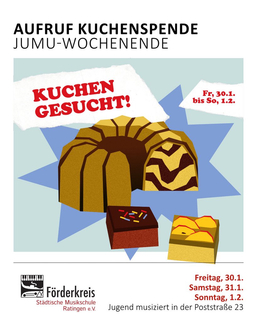 da wir als Städtische Musikschule Ratingen dieses Jahr Gastgeberin für den Regionalwettbewerb “Jugend musiziert” Kreis Mettmann sind, suchen wir noch nach Kuchenspenden, um die Teilnehmerinnen und Teilnehmern sowie ihre Begleitpersonen zwischendurch verpflegen und ihren Aufenthalt in der Musikschule versüßen zu können.