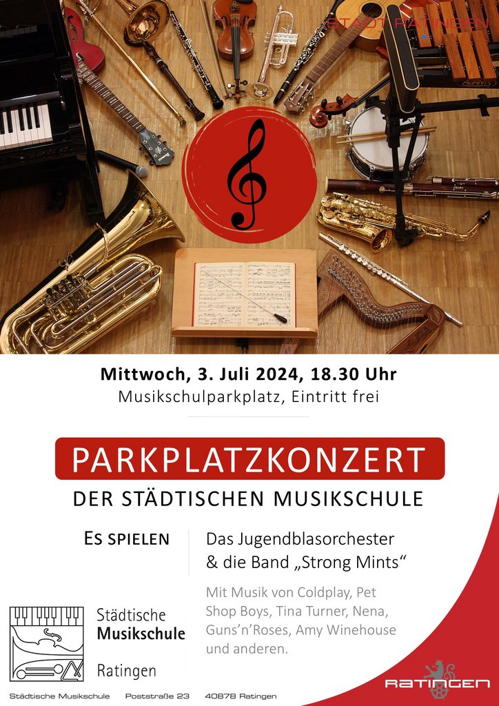 Im vergangenen Jahr hat die Musikschule erstmals Nachbarn und alle anderen Interessierten zu einem Open-Air-Konzert auf den Parkplatz hinter dem Musikschulgebäude, Poststraße 23 eingeladen. Die Resonanz war so positiv, dass das Jugendblasorchester und die Musikschul-Band „Strong Mints“ sich am Mittwoch, 03. Juli ab 18:30 Uhr wieder mit guter Laune und Live-Musik in die Ferien verabschieden.