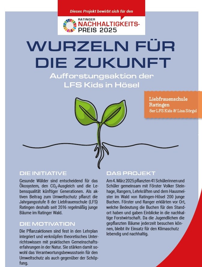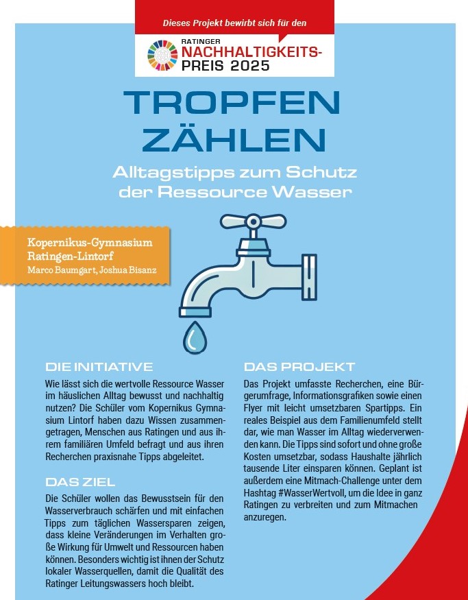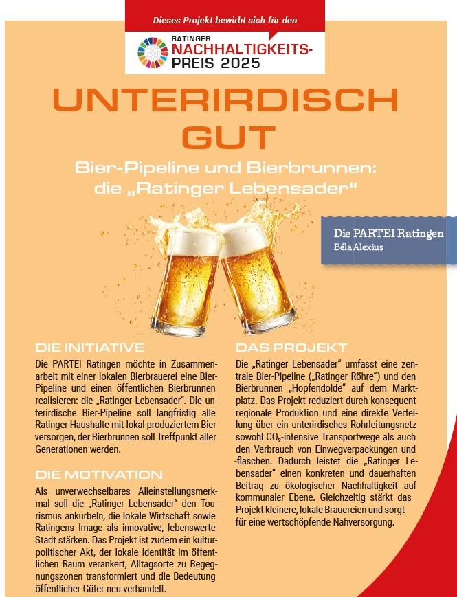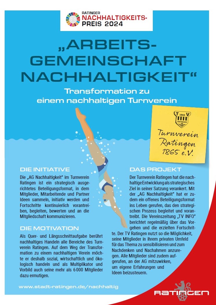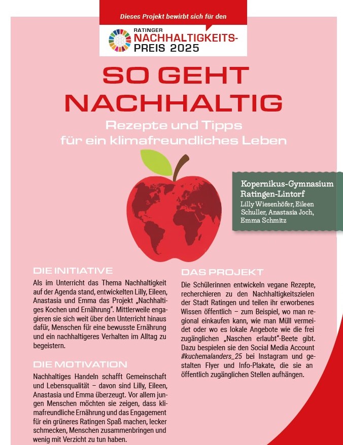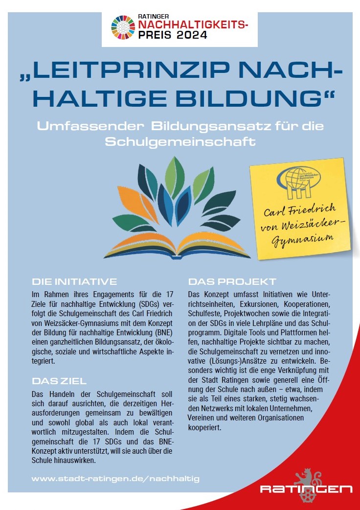 Das Bestreben nach mehr Nachhaltigkeit kann nur erfolgreich sein, wenn möglichst viele mitwirken! Mit dem Preis werden seit 2023 zukunftsweisende lokale Projekte ausgezeichnet, die in und für Ratingen durchgeführt werden. Der Stadtrat beschloss, den Preis jährlich zu vergeben, um bürgerschaftliches Engagement für eine nachhaltige Entwicklung zu würdigen und zu neuen Projekten zu motivieren.