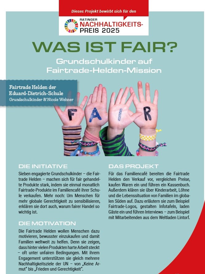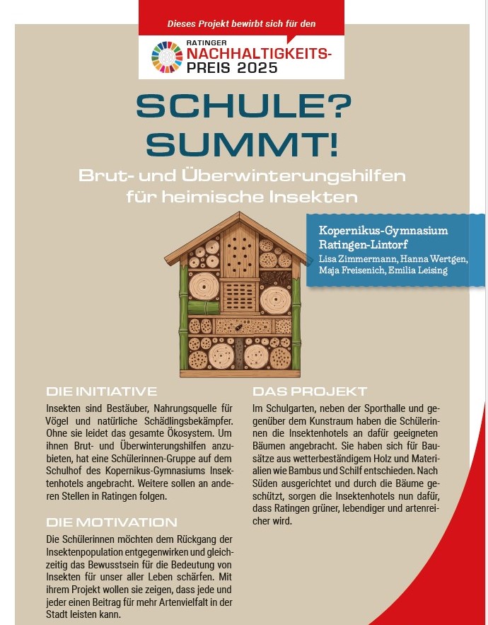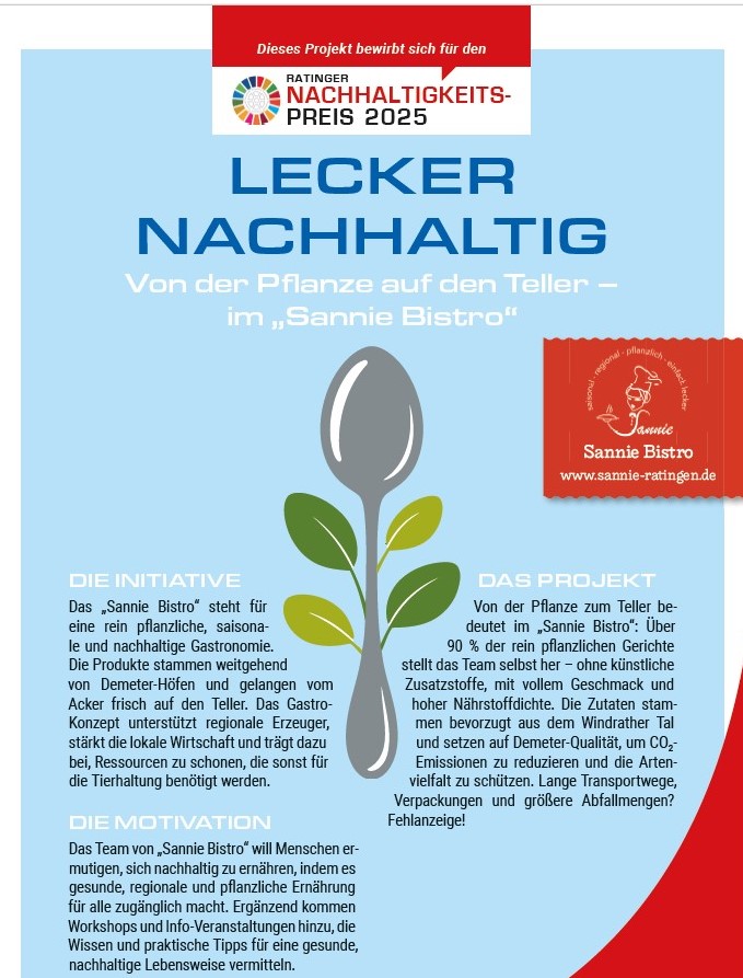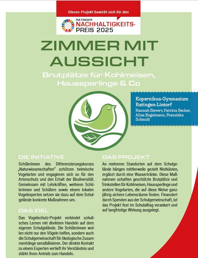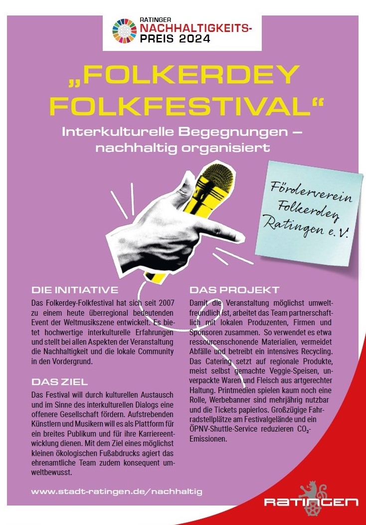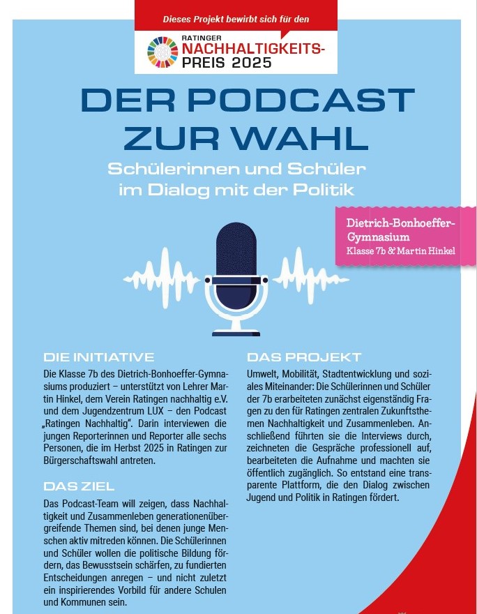 Das Bestreben nach mehr Nachhaltigkeit kann nur erfolgreich sein, wenn möglichst viele mitwirken! Mit dem Preis werden seit 2023 zukunftsweisende lokale Projekte ausgezeichnet, die in und für Ratingen durchgeführt werden. Der Stadtrat beschloss, den Preis jährlich zu vergeben, um bürgerschaftliches Engagement für eine nachhaltige Entwicklung zu würdigen und zu neuen Projekten zu motivieren.