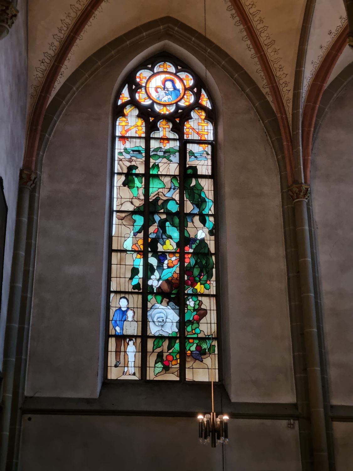 Im Krieg wurden die Fenster der Pfarrkirche zerstört - die heutigen Fenster stammen aus den 50er und 80er Jahren des vorigen Jahrhunderts. Sie greifen biblische Symbolik auf, die unsere ehrenamtlichen Führer:innen im Rahmen der Führung gerne erläutern.