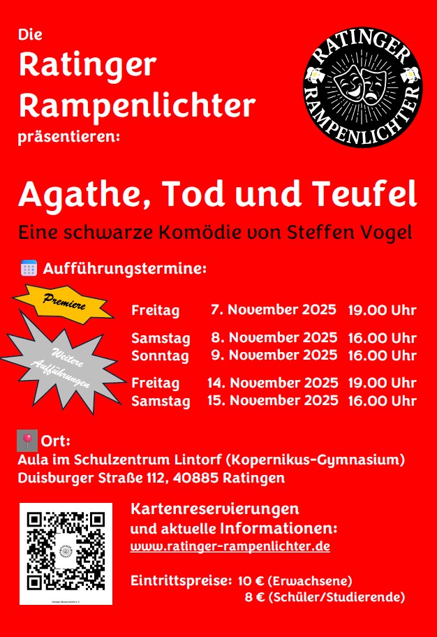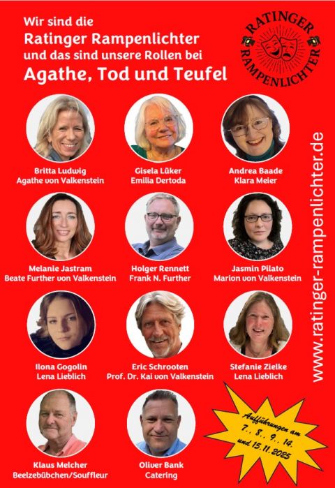 Mit "Agathe, Tod und Teufel" erleben Sie erstmals Aufführungen des Ende 2024 gegründeten gemeinnützigen Amateurtheatervereins Ratinger Rampenlichter e. V. Neben der tiefen Leidenschaft für die darstellenden Künste ist es das Ziel des Vereins, unterhaltsame Theateraufführungen auf hohem Niveau zu erschwinglichen Preisen zu präsentieren und dadurch Kunst und Kultur jedem Interessierten zugänglich zu machen. Hier kommen jahrzehntelange Routine und Newcomer jeden Alters zusammen, die alle eine Gemeinsamkeit haben: die Liebe zum Theater!