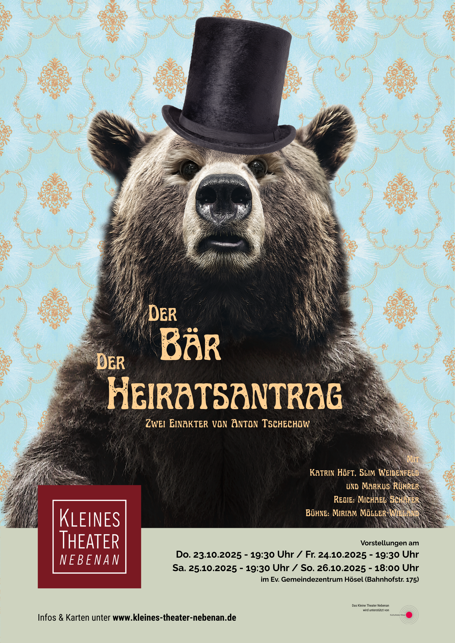 Anton Tschechow gehört zu den wohl bekanntesten Dramatikern der Theatergeschichte. Mir DER BÄR & DER HEIRATSANTRAG hat er seinerzeit zwei unterhaltsame Einakter geschrieben, die durch ihre Aktualität überraschen. Das Kleine Theater Nebenan bringt diese beiden Kabinettstückchen nun im Herbst nach Ratingen auf die Bühne.