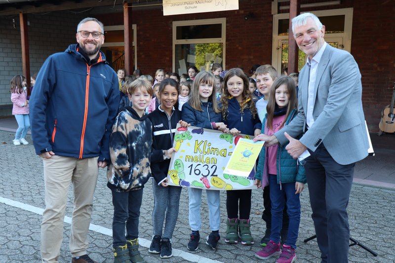 In diesem Jahr haben fünf Ratinger Einrichtungen an dem Projekt teilgenommen: die Johann-Peter-Melchior-Schule, die Heinrich-Schmitz-Schule, die Minoritenschule sowie der Waldorfkindergarten Rafael e.V. und die städtische Tageseinrichtung für Kinder an der Turmstraße. Am stärksten vertreten waren die Kinder der Johann-Peter-Melchior-Schule. Um dies zu würdigen, fand auf dem Schulgelände eine feierliche „Meilenübergabe“ und Urkundenverleihung durch Bürgermeister Klaus Pesch statt. Die Kinder der Melchior-Schule übergaben ihre 1.632 gesammelten Kindermeilen in Form eines kreativ gestalteten Plakates und erhielten im Gegenzug eine Urkunde für ihr Engagement im Klimaschutz. Diese Urkunde findet nun einen Platz in der Schule. Auch die weiteren Teilnehmer erhalten als Dank für ihre tolle Leistung eine Urkunde.