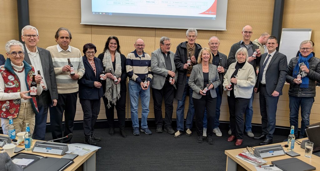 Mit einem herzlichen Dankeschön für die teils über viele Jahre geleistete ehrenamtliche Arbeit verabschiedete Bürgermeister Patrick Anders im Rahmen der Ratssitzung am 16. Dezember 13 ehemalige Ratsmitglieder, die nach der Kommunalwahl im Herbst aus dem höchsten Beschlussorgan der Stadt ausgeschieden sind. Als Geste des Danks und zugleich als Appetizer auf das bevorstehende Stadtjubiläumsjahr 2026 überreichte Anders ihnen je eine Flasche des frisch gebrauten Jubiläumsbiers „1276“.