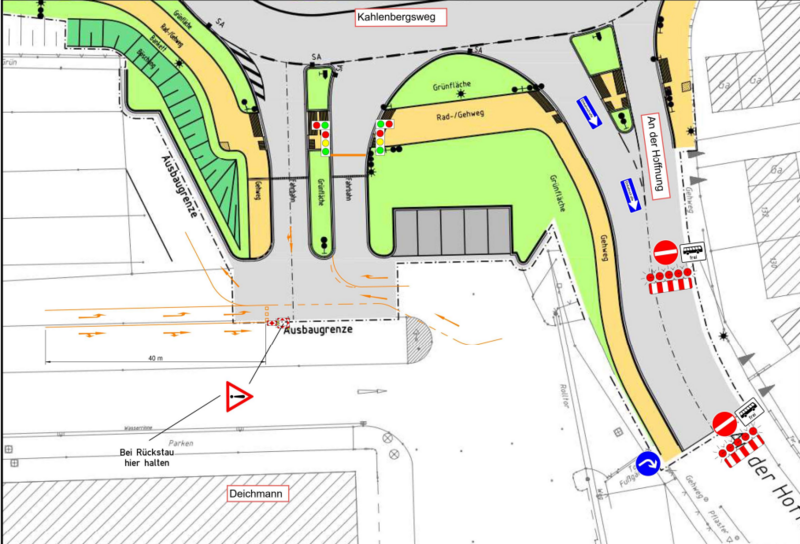 Die Bauarbeiten zur Herstellung des Kreisverkehrs Kahlenbergsweg starten am kommenden Montag, 15. April, mit der nächsten Bauphase. Dies hat zur Folge, dass sich die Zufahrtssituation zum Einkaufszentrum ändert. Die Zu- und Ausfahrt erfolgt dann über einen neu hergestellten Verkehrsanschluss an den Kahlenbergsweg, die Ausfahrt wird während der Baumaßnahme über eine Ampel geregelt. Die Straße „An der Hoffnung“ wird nur noch eingeschränkt nutzbar sein.