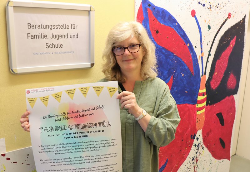Die Beratungsstelle für Familie, Jugend und Schule – vormals Psychologische Beratungsstelle - feiert ihr 30-jähriges Bestehen in der Trägerschaft der Stadt Ratingen. Dieses Jubiläum nimmt die Abteilung des Amtes für Kinder, Jugend und Familie zum Anlass für einen Tag der offenen Tür am Donnerstag, 6. Juni. Gefeiert wird mit Kooperationspartnern, Erziehern, Lehrkräften, Ehemaligen, Eltern, Kindern und Jugendlichen von 14 bis 18 Uhr an der Philippstraße 21. „Aber auch alle anderen Interessierten, die spontan vorbeischauen möchten, sind herzlich eingeladen“, sagt Karin Hassinger-Reißmüller, Leiterin der Beratungsstelle.