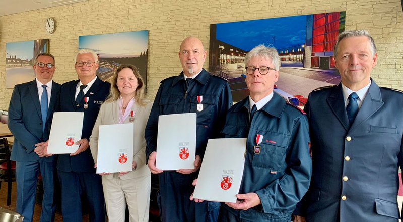 Festlich wurde es am Mittwoch, 16. Oktober, in den Räumlichkeiten der Feuerwehr Ratingen auf dem Voisweg: Der Leiter der Feuerwehr Ratingen, Brandrat Markus Feier, und der Feuerschutzdezernent Harald Filip verliehen das Ehrenabzeichen der Feuerwehr Ratingen in Silber. Ausgezeichnet werden Menschen, die sich in besonderem Maße für die Feuerwehr und über einen langen Zeitraum hinweg einsetzen und verdient gemacht haben. Für ihre Leistungen und die andauernde Unterstützung und Zusammenarbeit wurden Heike Schulz (Kriminaldirektorin aus Düsseldorf), Marcus Köhler (Standort Hösel), Frank Bauernfeind (Polizei Kreis Mettmann) und Jan-Hendrik Neumann (Berufsfeuerwehr) ausgezeichnet. Herzlichen Glückwunsch!