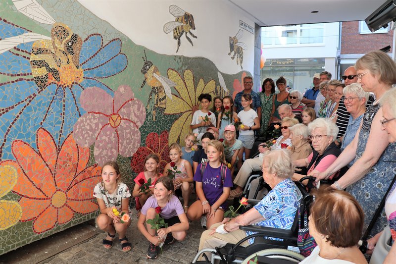 Allmählich werden sie zu einem Ratinger Markenzeichen, die bunten, großräumigen Mosaikkunstwerke vor allem auf Häuserwänden in der historischen Ratinger Innenstadt. Am 28. August wurde im Durchgang zwischen der Bechemer Straße und der Straße Am Alten Steinhaus schon das dritte Mosaikbild enthüllt, das die Ratinger Künstlerin Sarah Rose zusammen mit vielen Kindern erstellt hat. Diesmal gab es noch eine generationenverbindende Besonderheit: Auch Bewohnerinnen und Bewohner des Seniorenzentrums 360° haben an der der Gestaltung der farbenfrohen Blumen- und Insektenlandschaft mitgewirkt.
