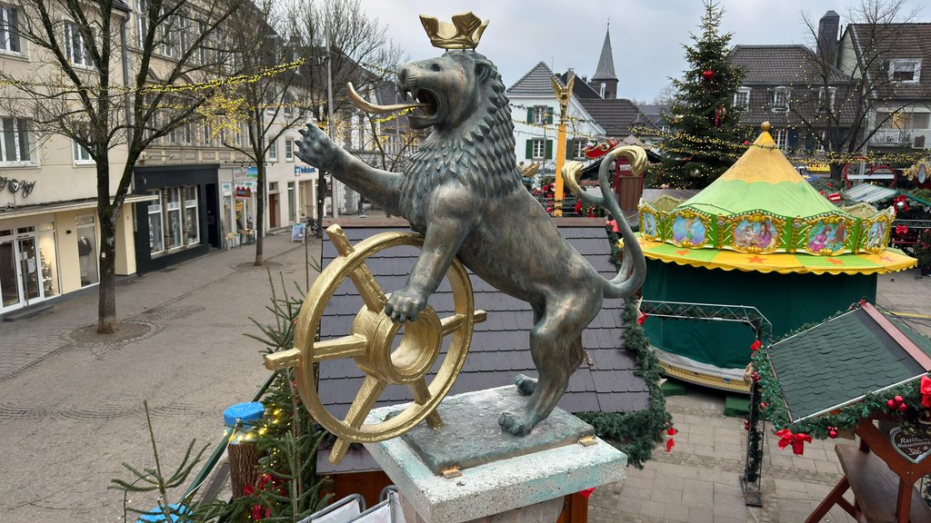 Der Bergische Löwe ist das Wappentier der Stadt Ratingen. In seinen Pranken hält er ein sechsspeichiges Rad - das sogenannte „Richtrad“, das Teil des offiziellen Stadtwappens von Ratingen ist. Die Löwenskulptur am Marktbrunnen von 1975 ist ein Werk des Düsseldorfer Künstlers Professor Hans Breker.