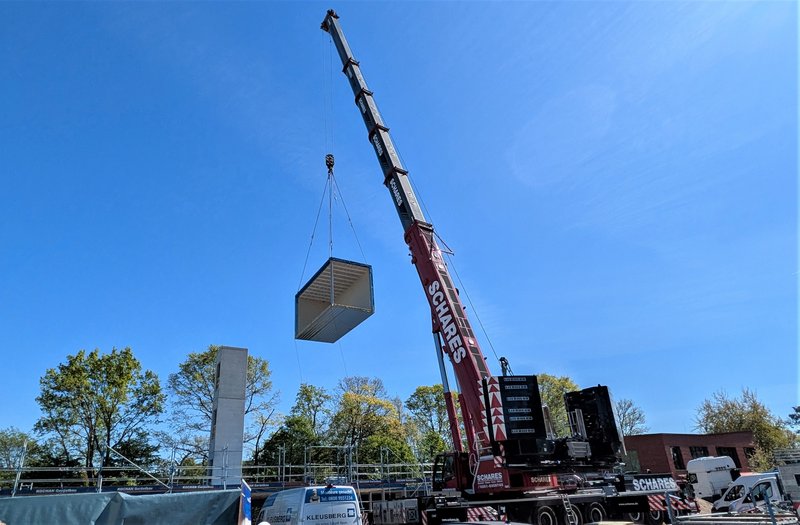 Im Moment ist gut sichtbar Bewegung drin. Tag für Tag fahren acht bis elf übergroße Sattelschlepper vom Parkplatz des Schulzentrums aus die Baustelle an. Jeder transportiert ein acht mal vier Meter großes und acht Tonnen schweres Raummodul. Innerhalb weniger Minuten hievt ein Schwerlastkran die Module von den Lkw und passt sie wie überdimensionierte Legosteine an die vorgesehene Stelle im Bau ein. Dann werden die Module verschraubt, so wächst die neue Schule praktisch jede Woche um ein Geschoss in die Höhe. 144 Module werden es am Ende sein, voraussichtlich im Juni kann schon Richtfest gefeiert werden.