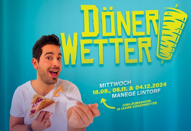 Seit bald 15 Jahren gibt es „DönerWetter“, die Kabarettshow mit Volkan Erik und seinen Gästen. Nach den Sommerferien geht`s in der Manege Lintorf an der Jahnstraße 28 in die nächste Staffel: Die Jubiläumsshow zum 15. Jubiläum findet am 18. September statt, die weiteren Termine sind am 6. November und am 4. Dezember. Ab Mittwoch, 24. April, 18 Uhr, startet der Vorverkauf.