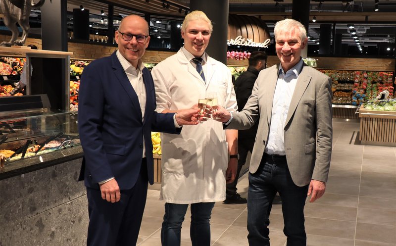Der zweite Ankermieter in den Wallhöfen, Edeka Kels, hat jetzt auch eröffnet. Am Mittwoch, 24. Januar, gingen unangekündigt die Türen auf, und es gab bereits eine Reihe zufällig anwesender Kunden, die ihre ersten Einkäufe beim neuen Vollsortimenter in der Ratinger City erledigten. Offizielle Eröffnung ist am 25. Januar. Bei einem Besuch am Mittwoch gratulierte Bürgermeister Klaus Pesch dem Inhaber Felix Kels zum gelungenen Start des Geschäftes, das den Einkaufsstandort Ratingen-City noch attraktiver macht.
