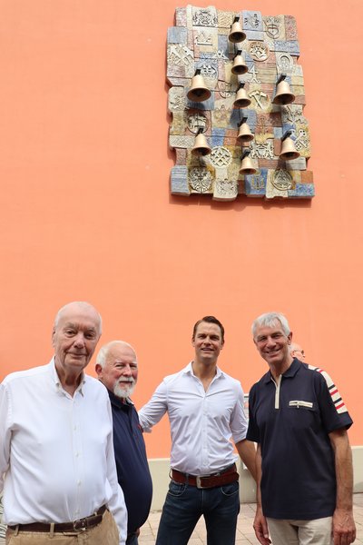 Noch im hohen Alter sorgte Dr. Alfred Dahlmann (links) dafür, dass das Glockenspiel, ein Ratinger Wahrzeichen, gerettet wurde und eine Renaissance beim Café Bös erlebte, hier bei der Einweihung im Sommer 2022 mit Bürgermeister Pesch, Alexander Bös und dem Künstler Heinrich Tuttaß. (Foto: Stadt Ratingen)