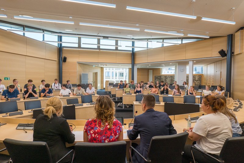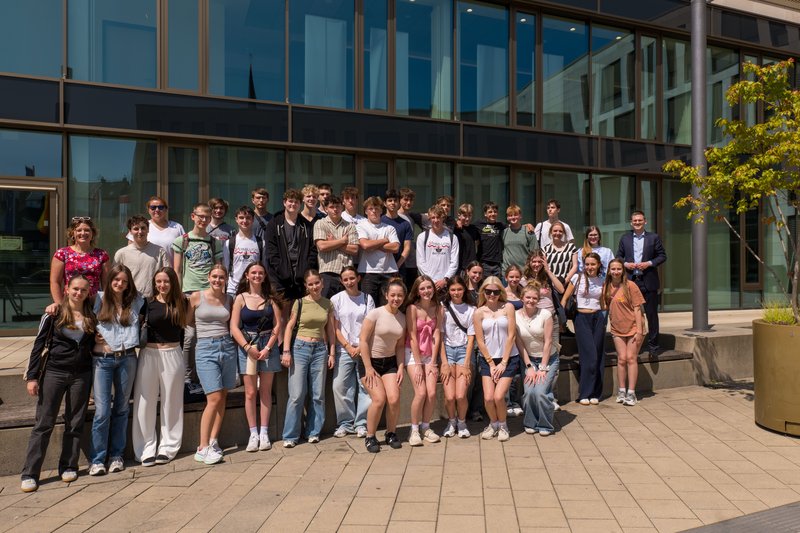 Eine Schülergruppe aus der Ratinger Partnerstadt Vermillion (Süd-Dakota/USA) und Schülerinnen und Schüler des Dietrich-Bonhoeffer-Gymnasiums empfing der Erste Beigeordnete und Schuldezernent Patrick Anders am Rathaus. Seit dem 5. Juni - und noch bis zum 19. Juni - sind 18 Schülerinnen und Schüler der Vermillion High School mit ihren Lehrerinnen Kamden Dibley und Lenni Bilberg zu Besuch bei ihrer Ratinger Partnerschule in West und erleben ein abwechslungsreiches Programm: Besuche in Köln und Düsseldorf, im Phantasialand, Stand-up-Paddling am Grünen See sowie Ausflüge mit den Ratinger Gastfamilien. Den Austausch mit der Vermillion High School gibt es seit 2014, organisiert wird er seitens des DBG von Linda Boehnke. Nach der Begrüßung lud Patrick Anders die jungen Gäste in den Ratssaal ein und beantwortete Schülerfragen.