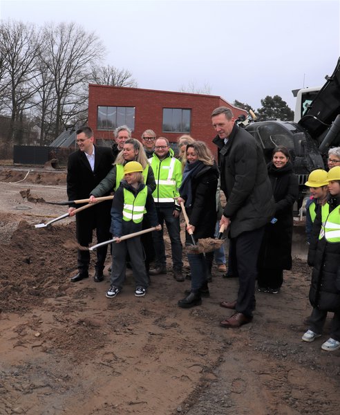 Der Neubau der Heinrich-Schmitz-Schule in Lintorf ist wieder einen großen Schritt weitergekommen. Am 10. Februar wurde mit allen Projekt-Beteiligten der symbolische Erste Spatenstich für den Bau auf dem ehemaligen Sportplatz an der Brandsheide begangen. Auch einige Grundschülerinnen und Grundschüler waren gekommen, um den Beginn der Bauarbeiten für ihre zukünftige Schule live mitzuerleben – neugierig beobachtet von vielen Kindern aus der benachbarten Kita, die im Neubau sicher ebenfalls über kurz oder lang die Schulbank drücken werden.