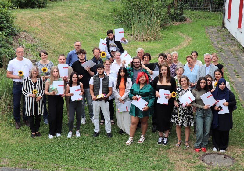 Erfolgreich ist der aktuelle Schulabschlusslehrgang des Projektes BOJE „Berufliche Orientierung junger Erwachsener“ zu Ende gegangen: 16 Schülerinnen und Schüler haben ihren angestrebten Abschluss erreicht und durften sich jetzt über ihre Zeugnisse freuen, die sie im Rahmen einer sehr persönlichen und liebevoll gestalteten Feier stolz entgegennahmen. Bürgermeister Klaus Pesch, Dezernent Prof. Dr. Bert Wagener, VHS-Leiter Jörg Althen, Projektleiterin Ilka Dee und das gesamte BOJE-Team wünschten den Schülerinnen und Schülern alles Gute und viel Erfolg für den weiteren Lebens- und Berufsweg.