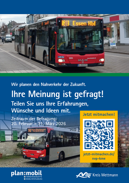 Wie soll der Öffentliche Personennahverkehr (ÖPNV) im Kreis Mettmann künftig verbessert werden? Im Rahmen einer Onlinebeteiligung haben nun alle Menschen im Kreis Mettmann die Möglichkeit, ihre Einschätzungen, Bedarfe und Wünsche zum Nahverkehr mitzuteilen. Hintergrund ist die Neuaufstellung des Nahverkehrsplans mit dem Ziel, den ÖPNV im Kreis Mettmann weiterzuentwickeln. Die Onlinebeteiligung ist unter https://www.jetzt-mitmachen.de/nvp-kme/ erreichbar. Die Teilnahme ist bis einschließlich 31. März 2026 möglich.