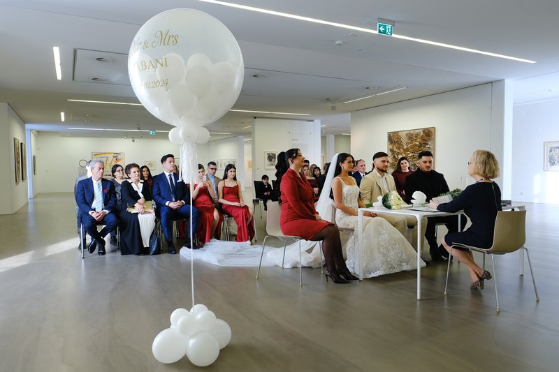 Erstmals haben jetzt Trauungen im Museum Ratingen stattgefunden. Am Freitag, 2. Februar, gaben sich fünf Brautpaare im künstlerischen Ambiente das Ja-Wort. Diese Premiere war zugleich ein Probelauf für das Standesamt, das Eheschließungen vorwiegend im Minoritenkloster vornimmt. Da dort aber aktuell bis voraussichtlich Ende März im Innenhof lautstarke Kanalsanierungsarbeiten durchgeführt werden, hatte man sich im Vorfeld nach einer alternativen Hochzeitslocation umgesehen - und war mit dem hellen Ausstellungsraum des Museums fündig geworden. Ein weiteres Plus: Wer mag, kann dort auch noch einen Sektempfang im Anschluss an die Trau-Zeremonie buchen.