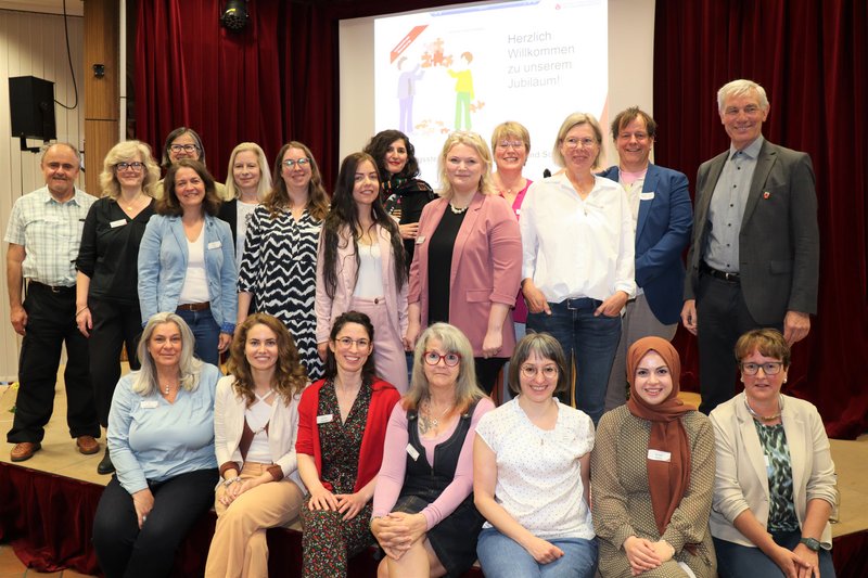 Der Einladung waren viele Kooperationspartner gefolgt. Zu den Gratulanten gehörte auch Bürgermeister Klaus Pesch, der die Gäste zu Beginn der Veranstaltung begrüßte. Zum Gruppenfoto auf der Bühne versammelten sich schließlich das Team der Beratungsstelle um die Leiterin Karin Hassinger-Reißmüller (2. v. links), Jugendamtsleiterin Sabine Klocke (untere Reihe, rechts) und der Referent Andreas Pauly von der Mediensuchtprävention NRW (hintere Reihe, 2. v. rechts).