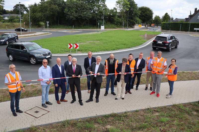 Der Kreisverkehr am Kahlenbergsweg in Breitscheid konnte jetzt bautechnisch fertiggestellt werden – nach gut einem Jahr Bauzeit und damit mehr als sechs Wochen früher als geplant. An Ort und Stelle informierten am 8. August Bürgermeister Klaus Pesch, Landrat Thomas Hendele und weitere an der Maßnahme Beteiligte über den Ablauf und Besonderheiten des Gemeinschaftsprojekts. Entstanden ist ein fünfarmiger, ovalförmiger Kreisverkehr im Zuge des Kahlenbergswegs (K19) mit Anbindung der Auf-/Abfahrt zur Kölner Straße (B1), der Straße An der Hoffnung und einer direkten Zufahrt zum Einkaufszentrum Breitscheid.