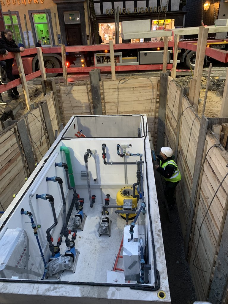 Die neue Brunnenkammer ist in einer Höhe von rund zwei Metern bequem begehbar. Der Betonkubus besteht aus zwei Kammern, eine enthält das Wasserreservoir, die zweite die Technik mit Pumpe und Reinigungssystem. Mit der neuen Brunnentechnik wird sichergestellt, dass der 50 Jahre alte Löwenbrunnen, inzwischen ein Wahrzeichen der Stadt, wieder zuverlässig sprudelt, was die alte Technik zuletzt nicht mehr gewährleisten konnte. Die alte Brunnenkammer, eher ein Kriechkeller unter dem Brunnen, bleibt übrigens bestehen, Teile des Leitungssystems werden weitergenutzt.