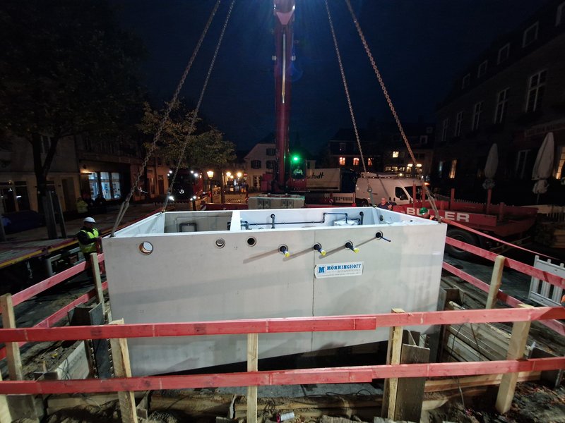 Nach dem erfolgreichen Einsetzen der Brunnenkammer geht es nun direkt weiter mit den Anschlussarbeiten der Technik an den Marktbrunnen und der Verfüllung der Baugrube. Spätestens zum 12. November ist aber Schluss, denn dann wird der Weihnachtsbaum auf dem Marktplatz aufgestellt. Anschließend beginnen die Aufbauarbeiten für den Weihnachtsmarkt (ab 21. November). Sollten noch Restarbeiten notwendig sein, werden diese dann erst nach dem Weihnachtsmarkt im neuen Jahr ausgeführt.