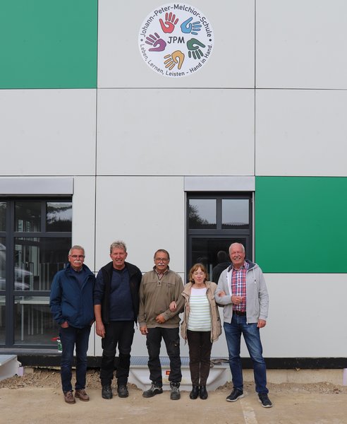 Haben kräftig angepackt, damit der OGS-Neubau an der Johann-Peter-Melchior-Schule schnell realisiert werden kann (v.l.n.r.): Thomas Schroeder, Stabsstelle für besondere Hochbauprojekte beim Bürgermeister, Schulhausmeister Klaus Klink, Hanshorst Sprenger, Christa Seher-Schneid und Rolf Steuwe, alle vom Verein für Über-Mittag-Betreuung.