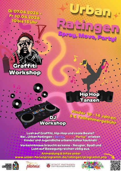 In der zweiten Osterferien-Hälfte, vom 7. bis 10. April, lädt das Jugendzentrum Phoenix in Tiefenbroich, Barbarastraße 16, in Kooperation mit dem Café du Nord zu einem einzigartigen, kreativen Ferienprojekt ein: „Urban Ratingen – Spray, Move, Party!“ lautet der abenteuerliche Titel, der viel Spaß verspricht. Es sind noch ein paar Plätze frei.