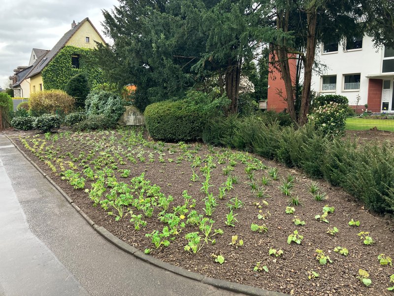 Die Abteilung Stadtgrün hat die Fläche frisch mit Stauden bepflanzt, die im Laufe der wärmeren Jahreszeit in den schönsten Farben erblühen werden. Eingefasst wird sie von einer Reihe Rhododendren und dahinter Eiben, die zum Teil ebenfalls neu gepflanzt wurden.