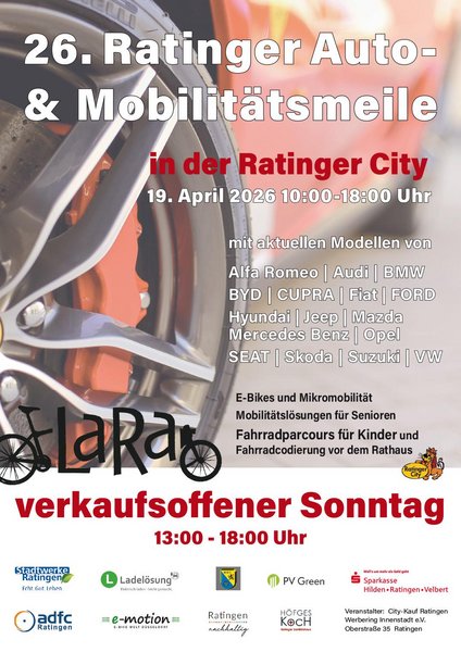 Im Jubiläumsjahr "750 Jahre Stadtrechte Ratingen" fügt sich die Ratinger Auto- und Mobilitätsmeile perfekt in das Festprogramm ein. Besucherinnen und Besucher erleben die Innenstadt als lebendigen Treffpunkt mit Handel, Gastronomie und Programm – ein starkes Signal für eine zukunftsorientierte, bürgernahe City. Die städtischen Parkhäuser werden an diesem Tag übrigens bis 20 Uhr geöffnet sein.
