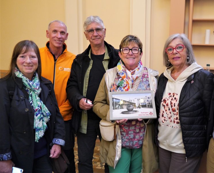 Bernadette Moriamé (2.v.r.), für Städtepartnerschaften zuständige Beigeordnete in Maubeuge, freute sich über eine gerahmte Ansicht des Ratinger Rathauses. An ihrer Seite ihr Beigeordneten-Kollege Dominique Delcroix und Ratsmitglied Annick Lebrun, links im Bild der Ratinger ADFC-Vorsitzende Helmut Löffelmann und Ratsmitglied Edeltraud Bell, die eigens mit dem Zug nach Maubeuge gereist war, um an der Begegnung teilzunehmen.