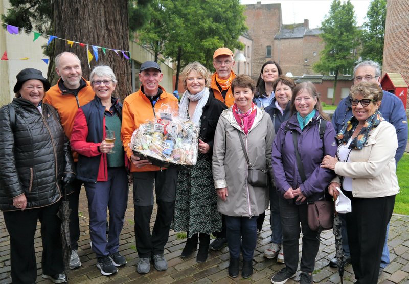 Mit regionalen Spezialitäten empfing Bürgermeisterin Marie-Sophie Lesne (5.v.l.) die Ratinger in Le Quesnoy. Über die gelungene Begegnung freuen sich mit ihr (u.a.): Marie-Christine Depelsenaire, Vorsitzende des Partnerschaftskomitees von Le Quesnoy (l.), die Erste Beigeordnete von Le Quesnoy, Axelle Declerck (7.v.l.), die ADFC-Tourenleiter Tim Fuhrmann (2.v.l.), Katharina Tsagournis (3.v.l.) und Bernd Hohgräfe (6.v.l.) sowie der ADFC-Vorsitzende Helmut Löffelmann (4.v.l.).