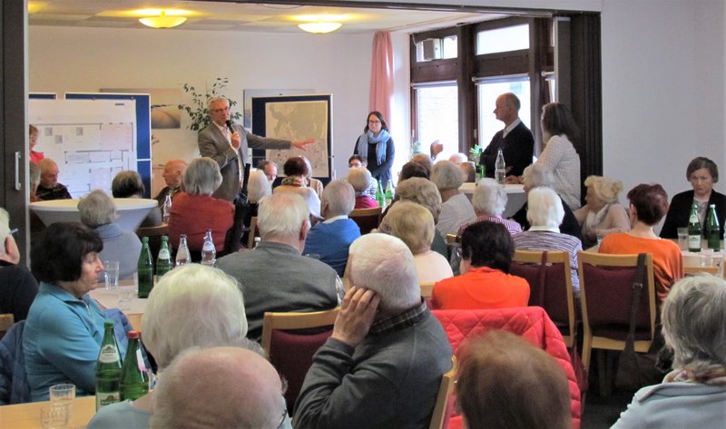 Die Überlegungen zum Bau eines neuen Seniorentreffs für Ratingen-West an der Liebigstraße fanden viel Zustimmung bei den Besucherinnen und Besuchern. Mehr als 100 von ihnen waren am Dienstag in den heutigen Treff an der Erfurter Straße gekommen, um sich ein Bild von den Plänen zu machen. Bürgermeister Klaus Pesch persönlich informierte die Besucherinnen und Besucher. Er hob hervor, dass sich in West gerade die einmalige Chance biete, für die Seniorinnen und Senioren des Stadtteils in kurzer Zeit einen Treff auf einer ganz neuen Qualitätsstufe zu errichten.