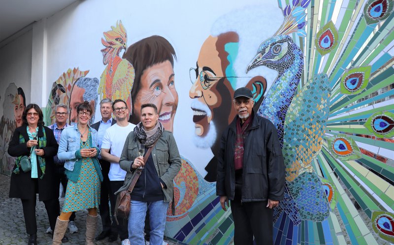 Zur Enthüllung des neuen Mosaik-Werks trafen sich (von links) die Immobilien-Eigentümer Manuela und Achim Egenberger, Mosaik-Künstlerin Sarah Rose, Gerold Fahr (Vorsitzender des Quartiersbeirates Ratingen Mitte), Graffiti-Künstler Julius Egenberger, Malerin Anja Schultz sowie Leonard Jones, einer der „Generationen-Köpfe“.
