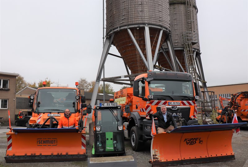 Die Kommunalen Dienste sind für Schnee und Eis gewappnet: Winterdienst-Chef Werner Kuth (rechts) und Mechaniker Patrik Carls haben dafür gesorgt, dass die Streumittel-Lager voll und die Fahrzeuge einsatzbereit sind. Neu angeschafft wurde die kleine grüne Arbeitsmaschine, die schmal genug für die Schneebeseitigung auf Radwegen, Brücken und Überwegen ist.