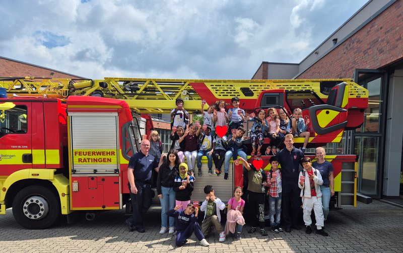 Eine „FIT“-Grundschulgruppen besuchte in den Sommerferien 2024 die Ratinger Feuerwehr. Zuvor hatten die Kinder die entsprechenden Vokabeln gelernt, sich über die vielfältigen Aufgaben der Feuerwehr schlau gemacht und auch geübt, einen Notruf abzusetzen. Alle Kinder haben zum Abschluss einen Feuerwehrausweis bekommen, den sie stolz in die Kamera halten.