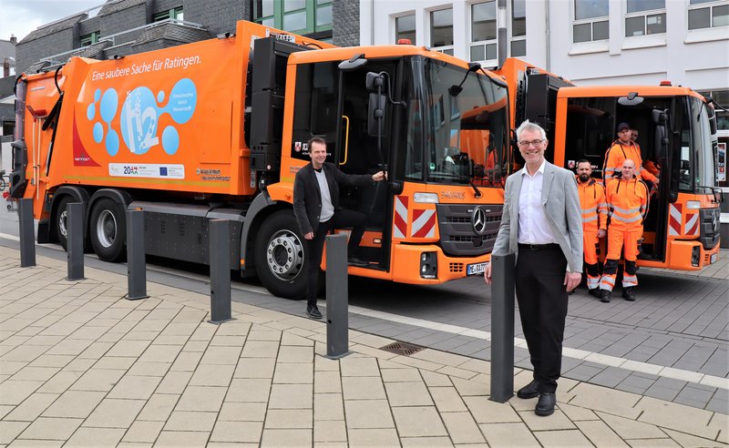Schon seit Jahren verfolgt die Stadt Ratingen konsequent das Ziel, den städtischen Fuhrpark auf abgasfreie Antriebe umzustellen und so einen wichtigen Beitrag zum Klimaschutz zu leisten. Die meisten städtischen Pkw fahren bereits elektrisch. Ab sofort sind nun auch zwei neue Abfallsammelfahrzeuge mit Wasserstoffspeicher und Brennstoffzelle auf den Ratinger Straßen unterwegs. „Dies ist eine Art Pilotprojekt für nachhaltige Mobilität, dieser Technik könnte im Schwerlastverkehr die Zukunft gehören“, sagte Bürgermeister Klaus Pesch bei der Vorstellung der Fahrzeuge. Diese machen mit dem Schriftzug „Eine saubere Sache für Ratingen“ und Aufklebern, die ein überdimensionales Wasserstoffmolekül samt Abkürzung H2 darstellen, ab sofort Werbung in eigener Sache.